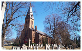 The original church was built in 1818 and older graves or gravestones were moved there from other sites. In 1846 a larger church was built and it burned two years after it was completed.The current church was dedicated in 1851.